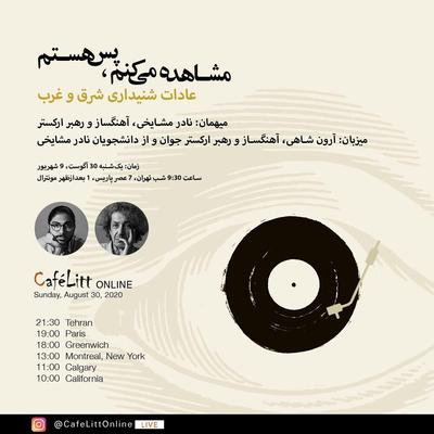کافه‌لیت روز یکشنبه ۳۰ اوت ميزبان نادر مشایخی، آهنگساز و رهبر ارکستر ساکن ایران، است. آرون شاهی، آهنگساز و رهبر ارکستر جوان و از دانشجویان نادر مشایخی، به نمایندگی از کافه‌لیت با نادر مشایخی درباره تفاوت های عادات شنیداری مردم شرق و غرب و اثرات آن بر نگرش و زندگی مردم گفت و گو می کنند.
